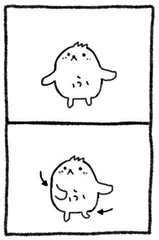 2コマ漫画。嬉しい時の動き ふにゃまるちゃんは、嬉...