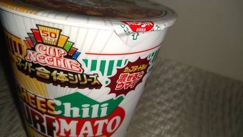 サイトから…「カップヌードル」発売50周年記念商品。間違いない味×間違いない味=絶対間違いない味! チリトマトと欧風チーズカレーを合体。トマトの酸味とチーズカレーの相性が抜群!