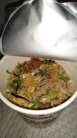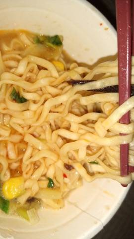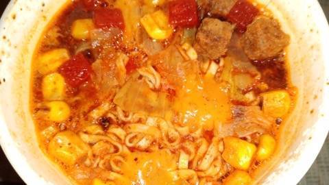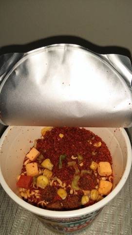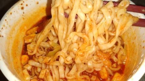 お箸を運んでる最中はチーズとカレーの香りが強くてカレーヌードル食べる口になってるけど口に入れるとチリトマトの味が勝つ!美味しいけど不思議な感じ。