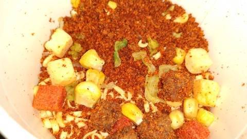 お肉にチーズ、キャベツ、コーン、トマトが入ってるかな。