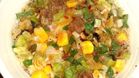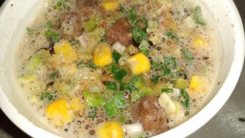 中のかやくは…きくらげ、お肉、コーン、キャベツ、ネギかな。