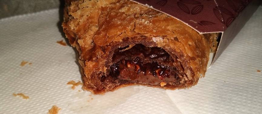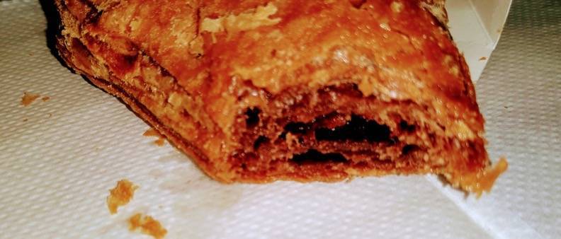 おぉ〜!!外サクサク!中はムチムチしていて美味しい!!最初はあまり期待していなかった三角パイだけど・・・これは良い!!外側の皮がかじる度にポロポロ落ちるけど、サクサクッとした噛みごごちで口の中で噛むと中のモチモチ生地の感触とチョコの味が最高!!