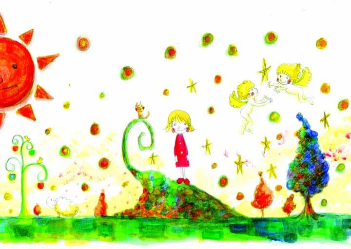 Transitioning to the right panel, the whimsical journey continues. A young girl in a simple red dress stands prominently on a swirling green hill. Above her, two joyful, cherubic figures with wings and golden hair dance playfully among stylized stars, watched by a curious cat perched on the hill’s curve. Scattered around are small, colorful trees and even a fluffy sheep, adding to the idyllic atmosphere. The ever-present smiling sun reappears in the upper left, visually linking the two illustrations. This scene radiates innocence and cheerful fantasy.