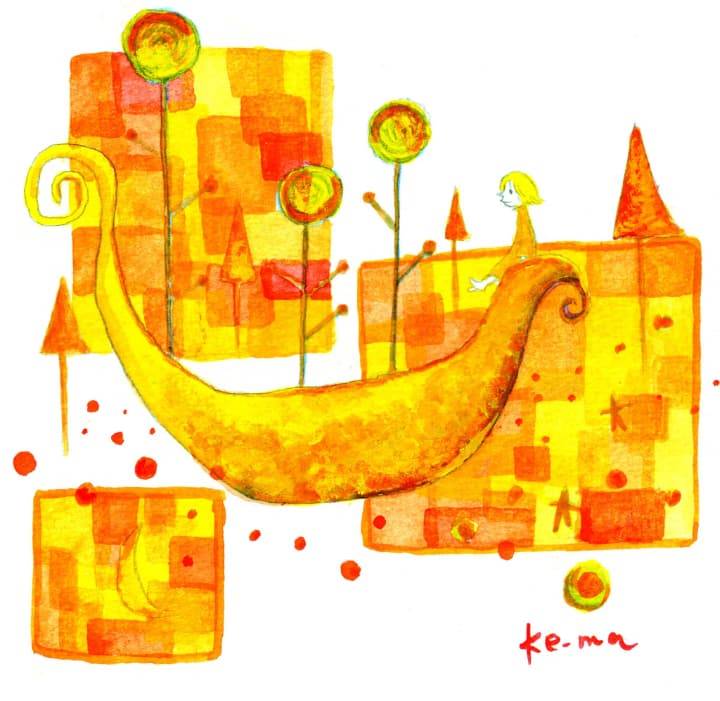 Embark on a journey into a world painted in shades of sunshine and autumn leaves! This delightful acrylic artwork invites us to float along a golden curve through an abstract landscape filled with warm hues and simple, enchanting forms. The vibrant yellows and oranges, layered and textured with the visible brushstrokes of acrylic paint, create a feeling of warmth, light, and gentle movement. It feels like a scene from a beautiful, quiet dream.