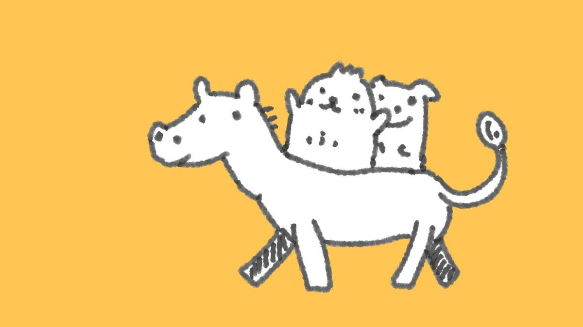 乗馬許可記念日:馬に乗るナマケモノのこどものふにゃまると犬のわんぽん