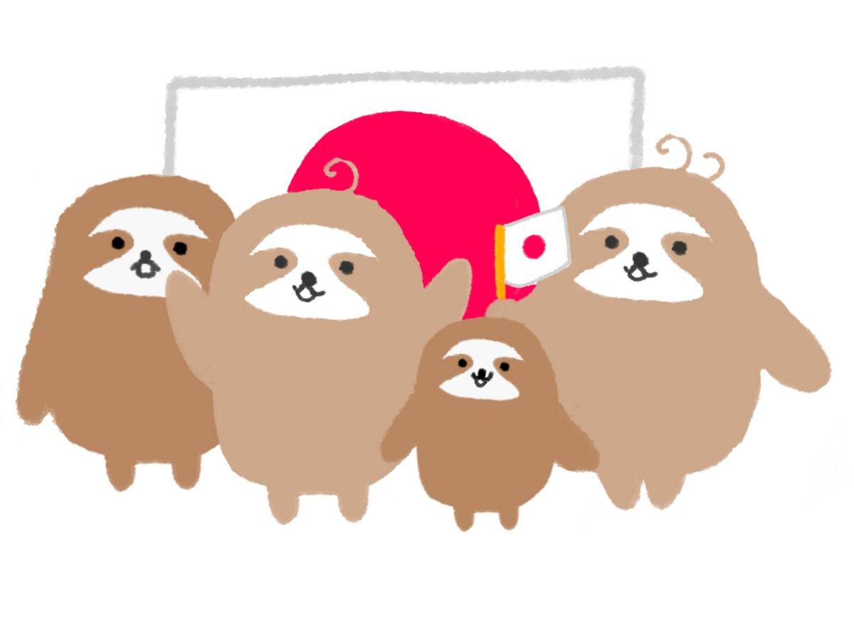 日本の国旗を持ち君が代を歌うナマケモノたち。背景に日本国旗。