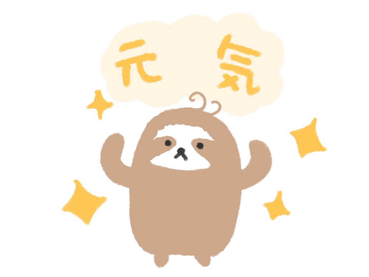 いっぱい食べれて元気な姿を披露するナマケモノ。背景はキラキラと輝き「元気」の文字が強調されている。