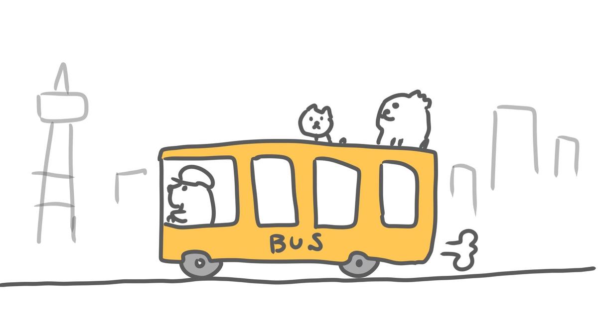 観光バスの日:黄色いバスに乗るナマケモノのこどものふにゃまると猫