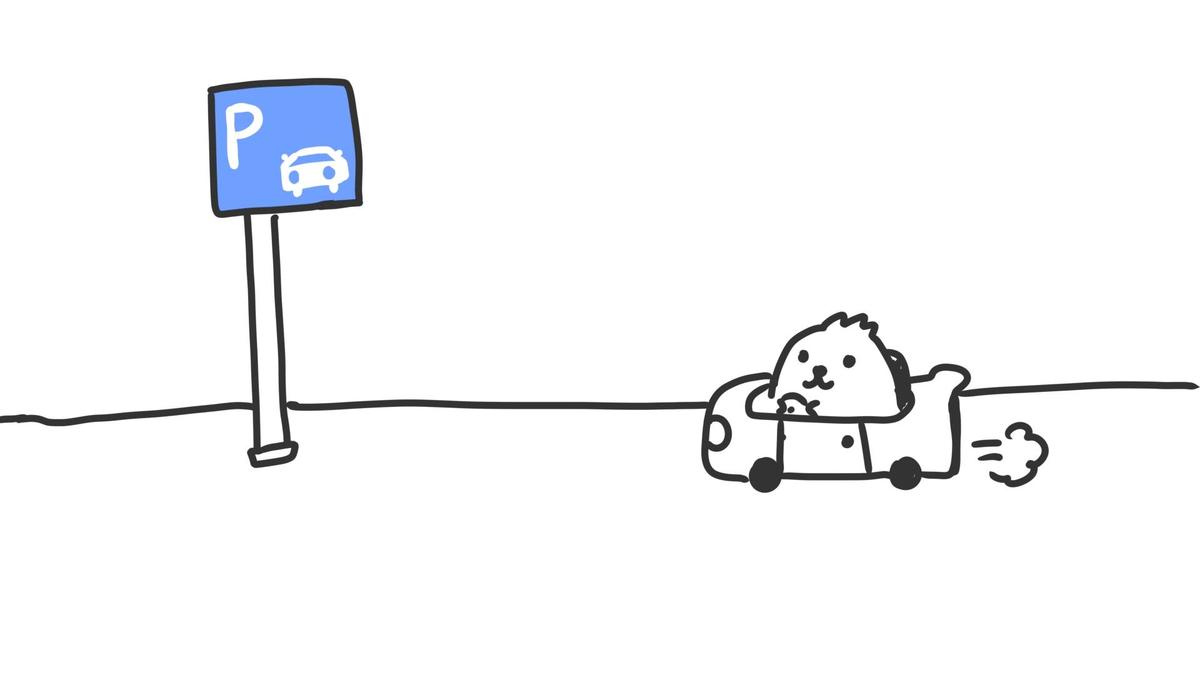 有料駐車場の日:車を運転しているナマケモノのふにゃまる。有料駐車場の看板を目にする。