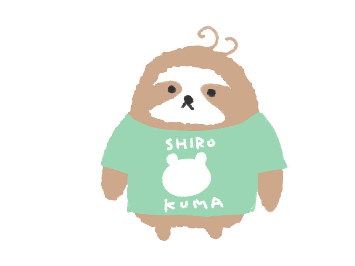 熊のシルエットとSHIROKUMAと書かれたTシャツを着ているナマケモノ
