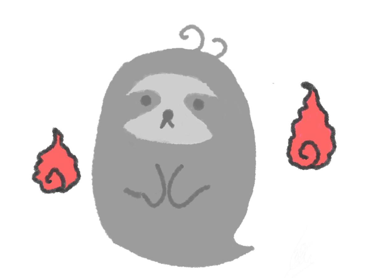 ナマケモノの幽霊。灰色の絵本チックな姿の幽霊とふたつの赤いヒトダマ。