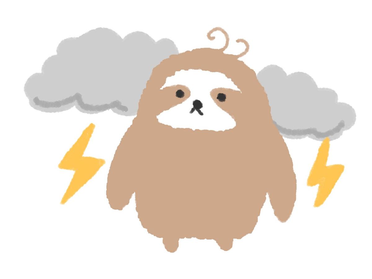 立っているナマケモノ。後ろでは雨雲と雷が光っている