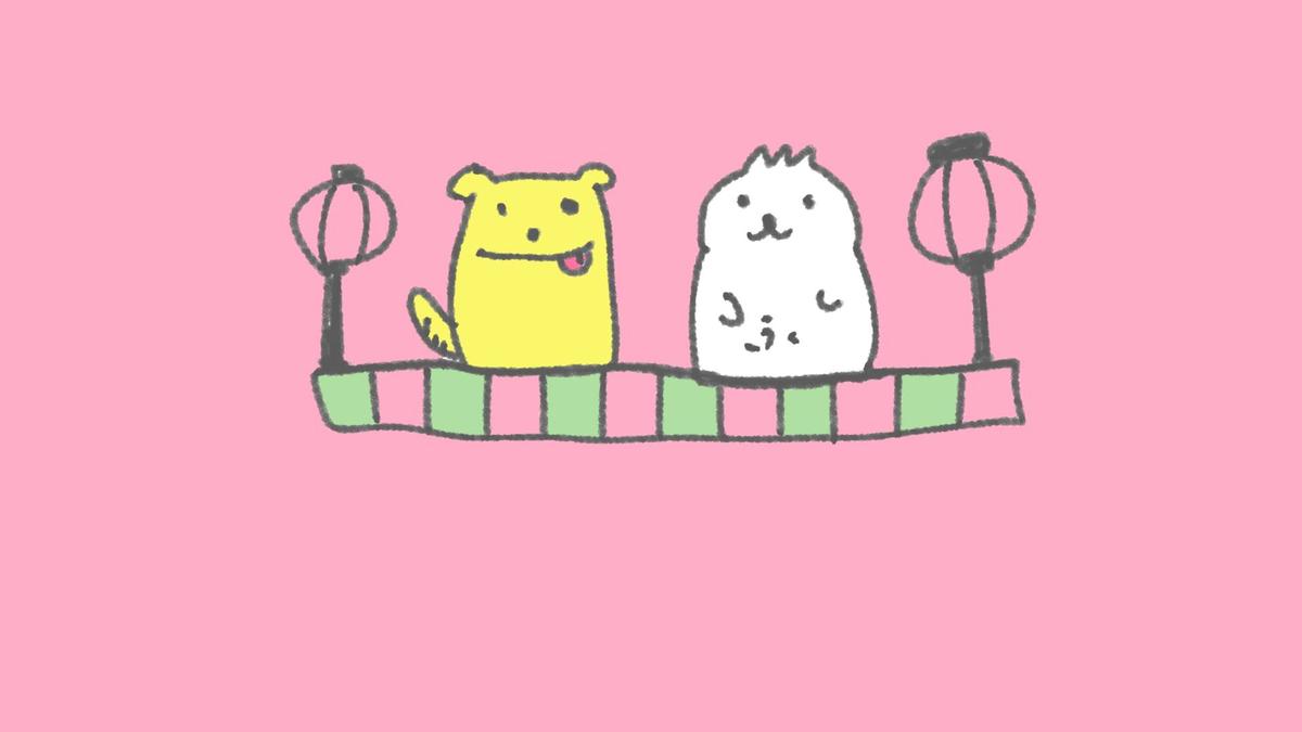 ひな壇に座るナマケモノのこどものふにゃまると黄色い犬のわんぽん