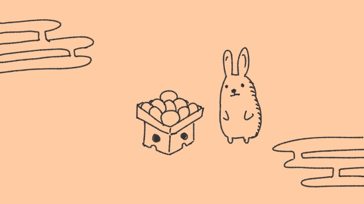 十六団子の日:山の神様にお供えする16個のお団子とそれを眺めるうさぎのイラスト