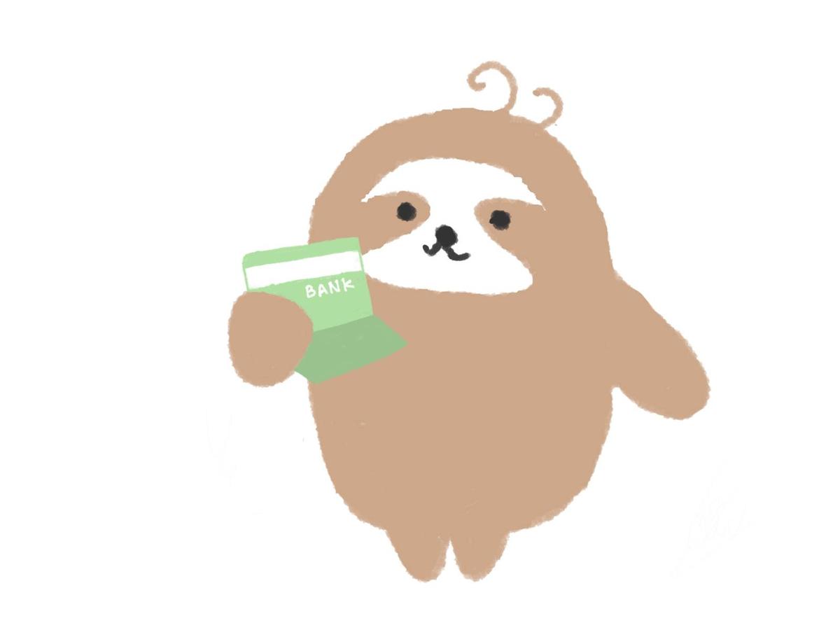 郵便貯金の日:通帳で残高を確認するナマケモノ