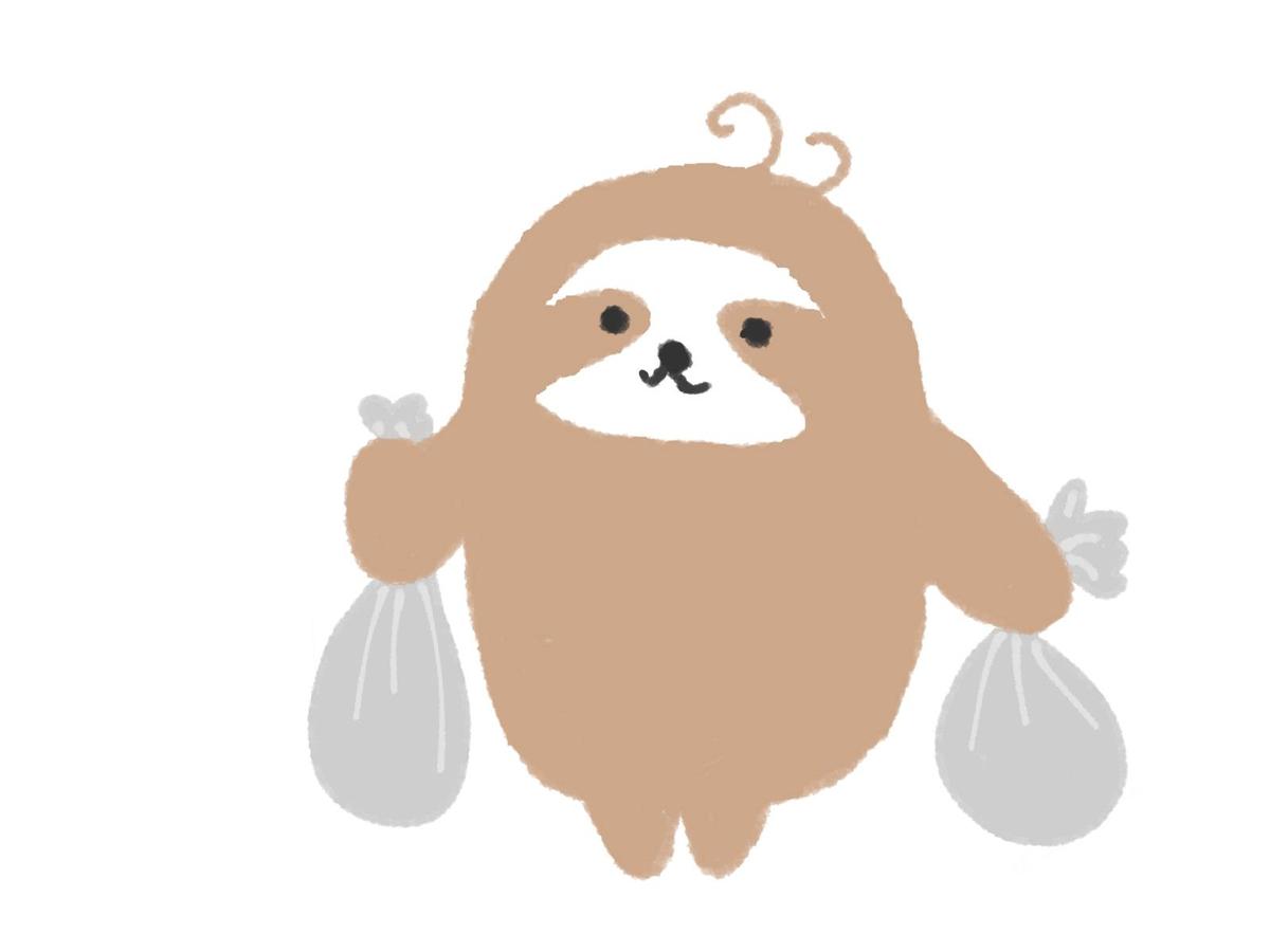 両手にゴミ袋を持って捨てに行くナマケモノのイラスト
