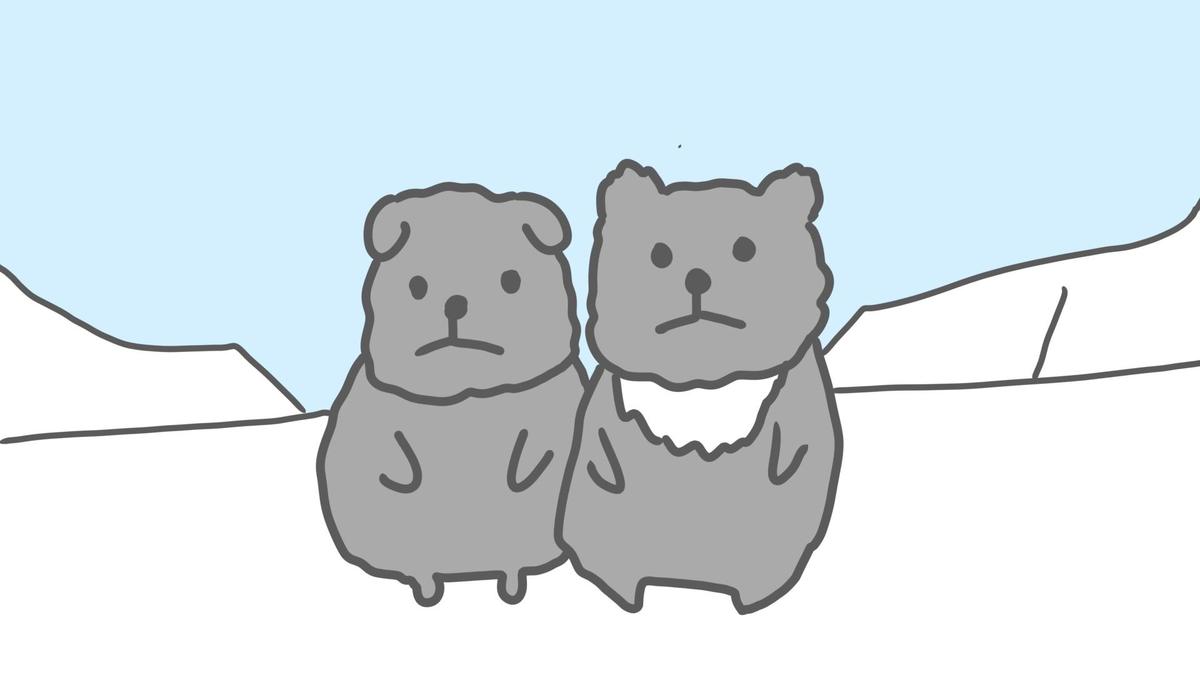 家族写真の日なので、ナマケモノの家族が写真を撮った。青い空、草原の中。数匹のナマケモノはバンザイをしている。