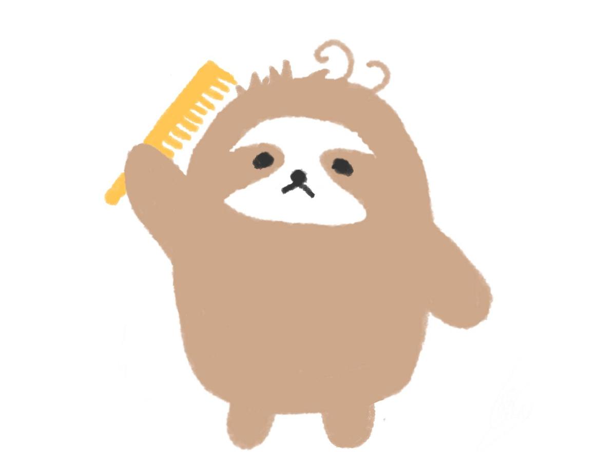 黄色いクシを持って寝癖をセットするナマケモノ